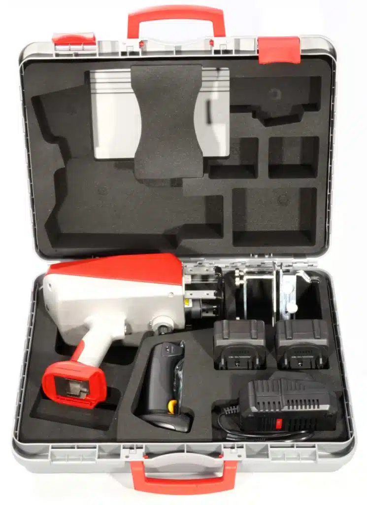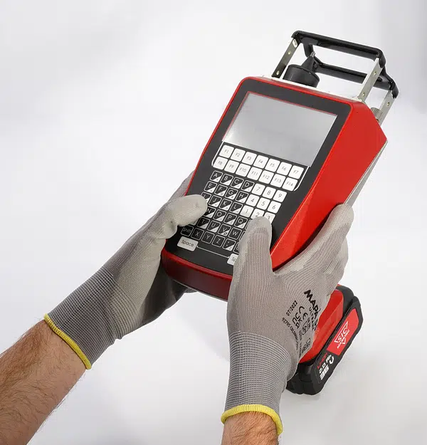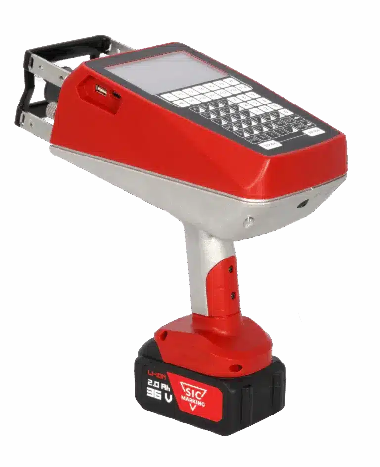 La E‑MARK EVO es una máquina portátil de marcado por micropercusión, inalámbrica y todo en uno, capaz de marcar todo tipo de materiales, desde plástico hasta acero tratado, hasta 62 HRC.